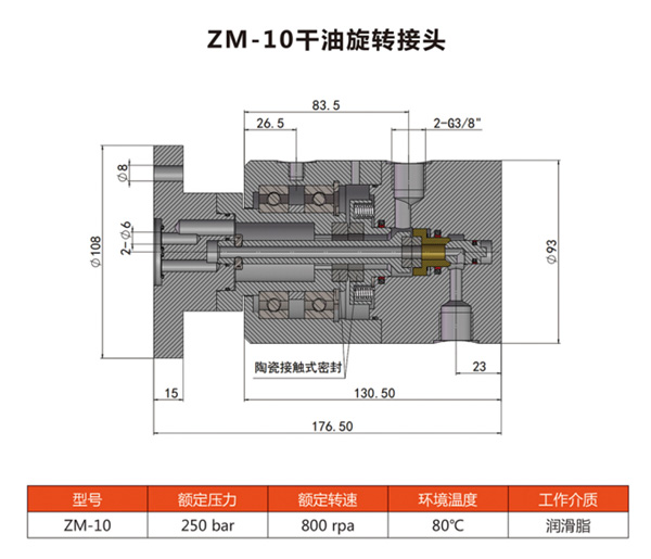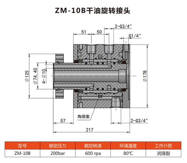 ZM-10B是大流量且有兩個單獨(dú)通道的干油旋轉(zhuǎn)接頭。接頭殼體上裝有自定心功能的陶瓷套,中心軸上裝有非常耐用的密封件,使其達(dá)到很好的密封效果。由于陶瓷套的光潔度和硬度非常高,陶瓷套與密封件之間滑動很順暢,極大的延長了接頭的使用壽命。但在運(yùn)轉(zhuǎn)時,由于密封件與陶瓷套摩擦接觸,存在發(fā)熱問題,需要配置循環(huán)的冷卻水消除。