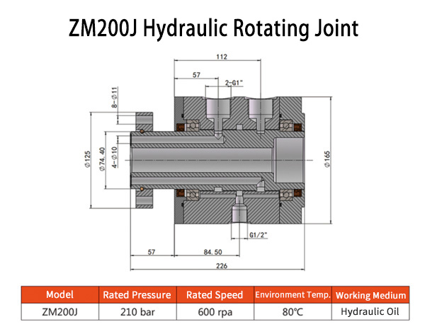 ZM200J hydraulic rotary joint use the small clearance between fixed parts and rotating parts, under the condition of high speed and high pressure to local change the flow area, cause a pressure loss of liquid flow, thus results in a very low leakage and returns to oil tank through the oil drainage port. This kind of sealing structure has high requirements for the geometrical size, surface machining precision and assembly of the parts.