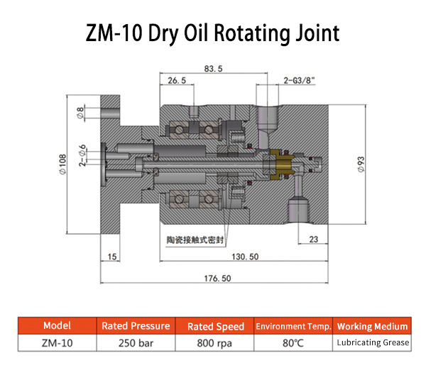 ZM-10 is a dry oil rotating joint which has two separate channels, with the ceramic contact seal axial rotary joint and equipped with automatic calibration compensation system, ensure the ceramic surfaces fully contact at all times. The shell is made of high strength aluminum alloy, the weight is very light. Due to the use of very durable ceramic contact sealing structure, to achieve a longer service life.