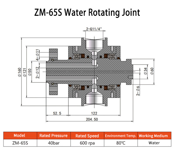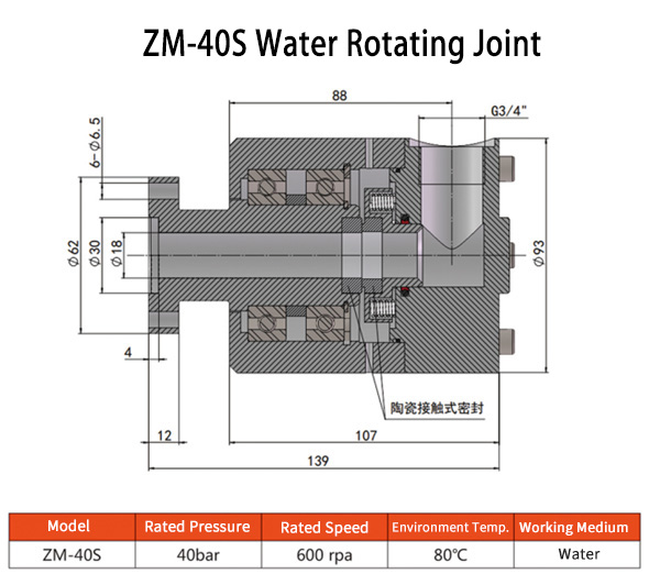 ZM-40S is a water rotating joint, the water flow through the center with single channel. Adopts ceramic contact seal design and equipped with automatic calibration compensation system, ensure the ceramic surfaces fully contact at all times, ensure no leakage. All parts adopt 304 stainless steel, equipped with ceramic bearing, ensure longer service life.