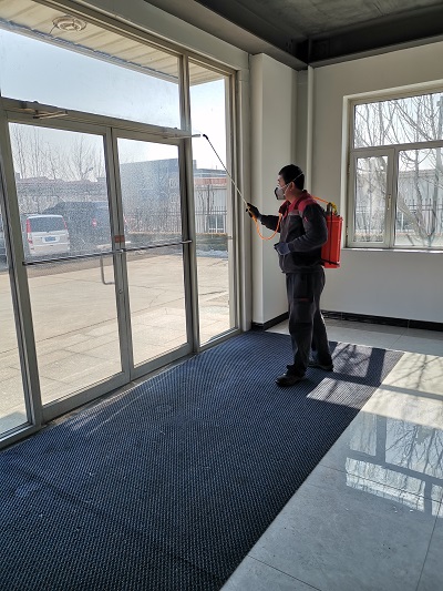 在疫情期間,公司每天安排人員對(duì)食堂、廁所、樓道等進(jìn)行噴霧消毒,并填寫消毒登記表。